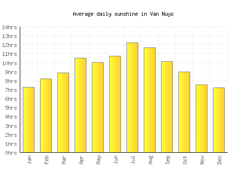 With an average of 99h of daylight December has the shortest days of the year in Van Nuys. Jan 01 Jan 04 Jan 07 Jan 10 Jan 13 Jan 16 Jan 19 Jan 22 Jan 25 Jan 28 Jan 31 50 60 70 80. Van Nuys has dry periods in May June July August September and October.